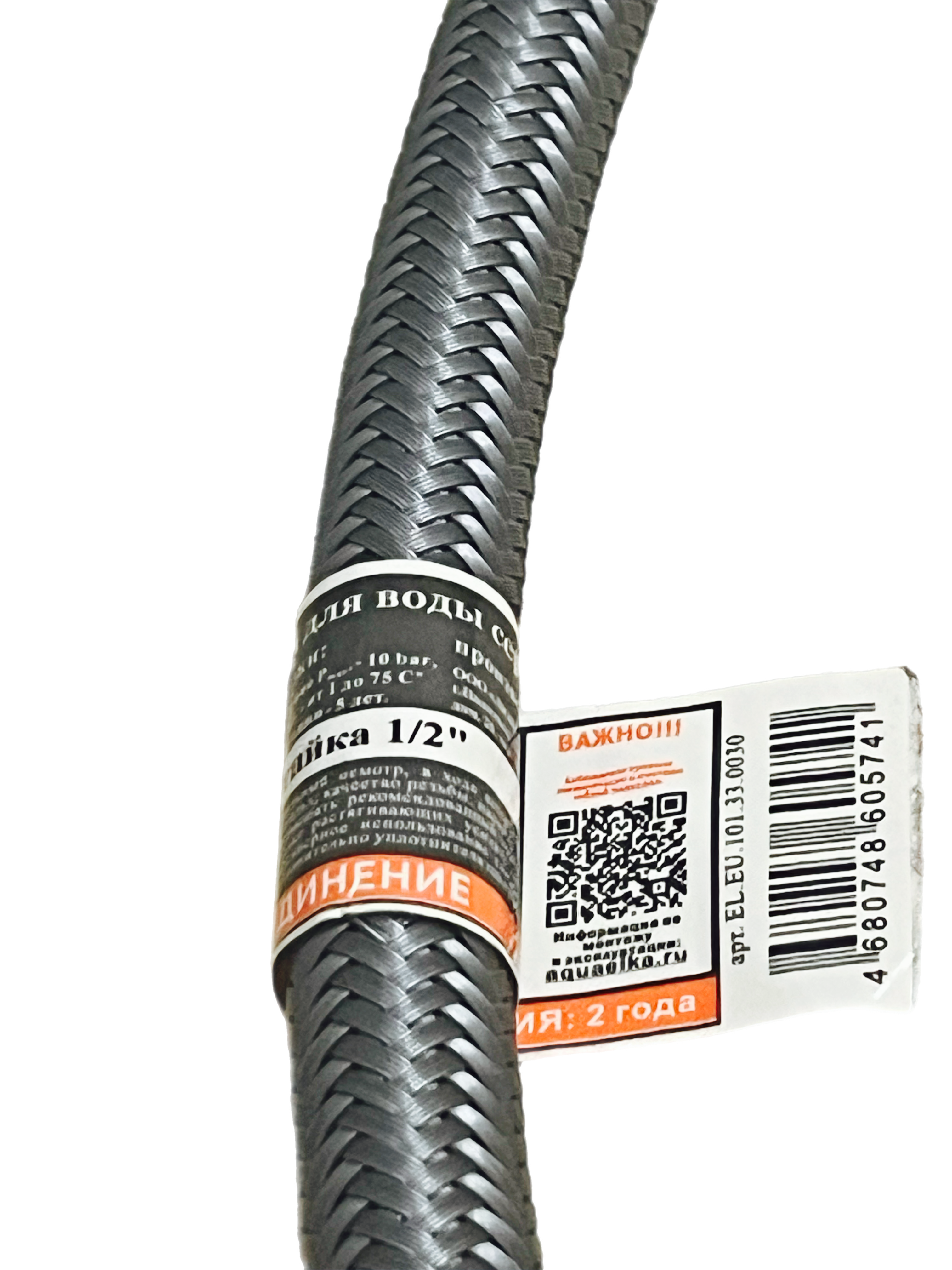 - Внутренняя трубка выполнена из этилен-пропиленового каучука EPDM — материала, устойчивого к высоким температурам (до +95 °C), хлорированной воде, агрессивным химическим средам и длительному термическому старению.
